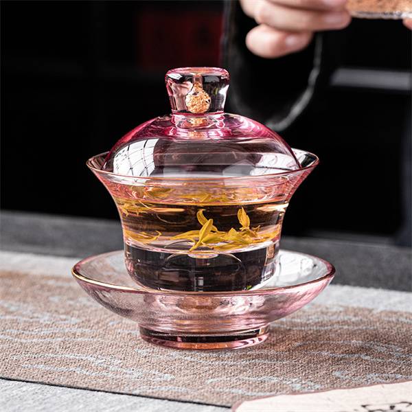 పింక్ గోల్డ్ లీఫ్ గ్లాస్ సప్లయర్స్ టూరీన్ పైభాగంలో మూత, దిగువన హోల్డర్ మరియు మధ్యలో గిన్నె ఉంటుంది. మూత ఆకాశాన్ని సూచిస్తుంది, మద్దతు భూమిని సూచిస్తుంది మరియు గిన్నె మానవుడిని సూచిస్తుంది, ఇది స్వర్గం, భూమి మరియు మానవుల అర్థాన్ని సూచిస్తుంది. ఇతర పదార్థాలతో పోలిస్తే, ప్రదర్శన మరింత అబ్బురపరుస్తుంది. గ్లాస్ ట్యూరీన్లో టీ కాచేటప్పుడు, మీరు టీ సూప్ రంగు మరియు టీ ఆకుల ఆకృతిని చూడవచ్చు. అదే సమయంలో, టీ యొక్క సువాసనను గరిష్ట స్థాయిలో నిలుపుకోవచ్చు. గాజు ట్యూరీన్ యొక్క సాంద్రత ఎక్కువగా ఉండాలి మరియు నీటి శోషణ రేటు తక్కువగా ఉంటుంది. ఇది టీ రుచిని గ్రహించదు మరియు వాసనను బదిలీ చేయదు. గ్లాస్ ట్యూరీన్ ఉపయోగించిన తర్వాత, టీ మరకలు శుభ్రం చేయడం సులభం మరియు గిన్నెలో రుచి ఉండదు. ఈ రోజుల్లో, అనేక వ్యాపారాలు గ్లాస్ టీ సెట్లలో తమ ఆవిష్కరణలను పెంచాయి. ఇప్పుడు అనేక గ్లాస్ టీ సెట్లు సేకరించబడతాయి మరియు విలువైనవి.